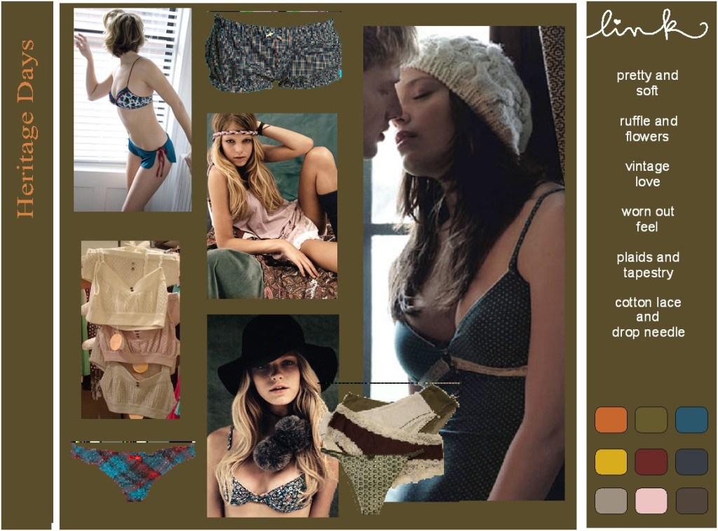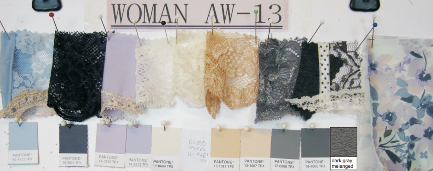 I am used to work with Pantone codes, but especially with underwear I found it useful to express the colour in real materials too.
